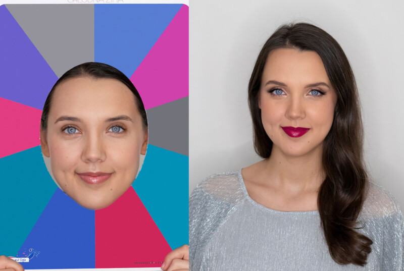 Ubolewam, że na zdjęciach efekt nigdy nie odda w pełni rzeczywistości, ale na żywo (i bez makijażu fotograficznego), moja modelka dosłownie zieleniała w każdej ciepłej barwie. Ziemistość cery plus czerwień naczynek na buzi wzmagały się w towarzystwie każdej barwy zawierającej żółty pigment. Jest to bardzo niekorzystne oddziaływanie koloru – buzia wygląda wręcz choro. Odwrotnie z zimnymi pigmentami – cera ujednolicała się i jaśniała, tęczówki skrzyły się błękitnym blaskiem, czerwień wargowa różowiała w towarzystwie barw opartych na niebieskości (najzimniejszej barwie).